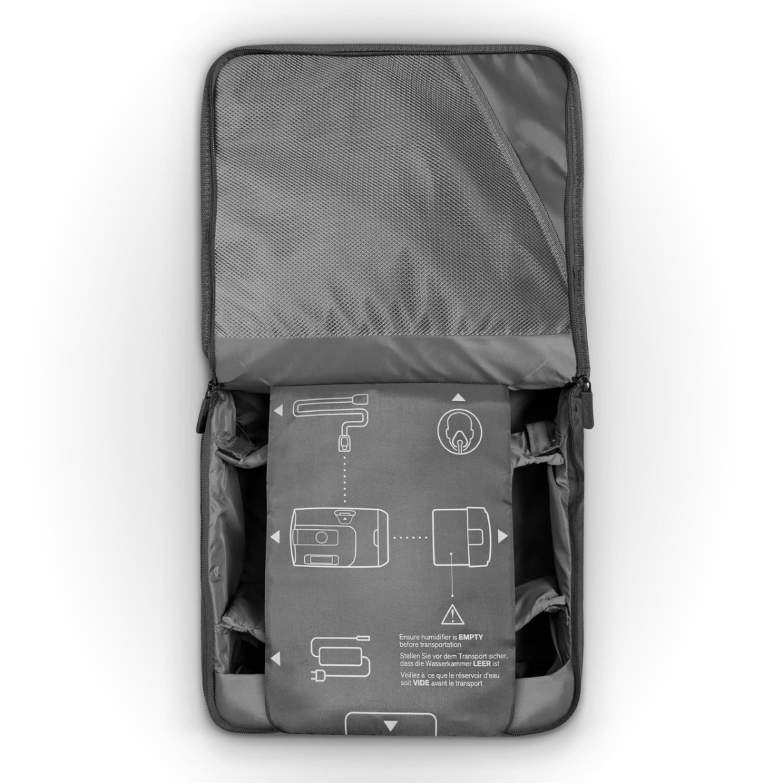 - Padded compartments for machine, tubing, mask and power supply